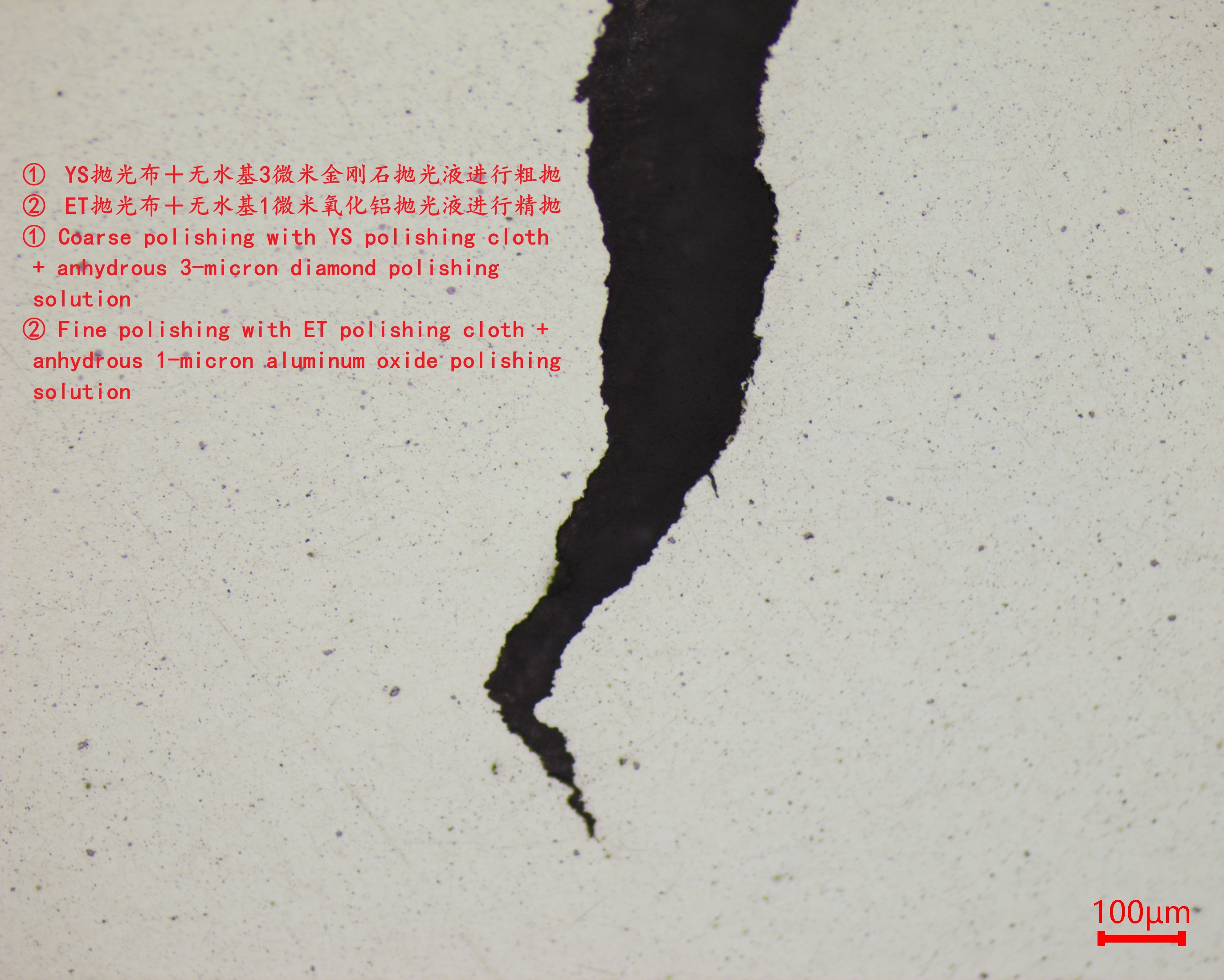 3. Penggilap halus dijalankan menggunakan kain ET yang menggilap dan penggantungan penggilap alumina 1-mikron bebas air.